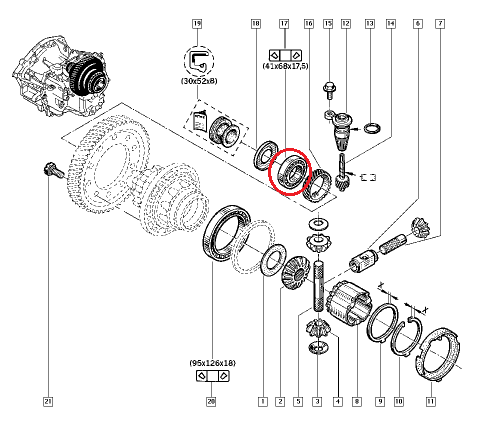 | fi | Vaihteiston laakeri (tasauspyörästö, oikea) 41x68x17,5 Renault PK5/PK6/PF6 |